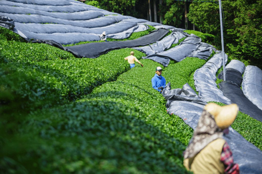70% of the sunlight is blocked and tea is shaded 25 days before harvest. 95% of the sunlight is blocked 15 days before harvest. All fields are then completely covered by black netting just days before picking. Thus resulting in tender fresh leaves ready for harvest.