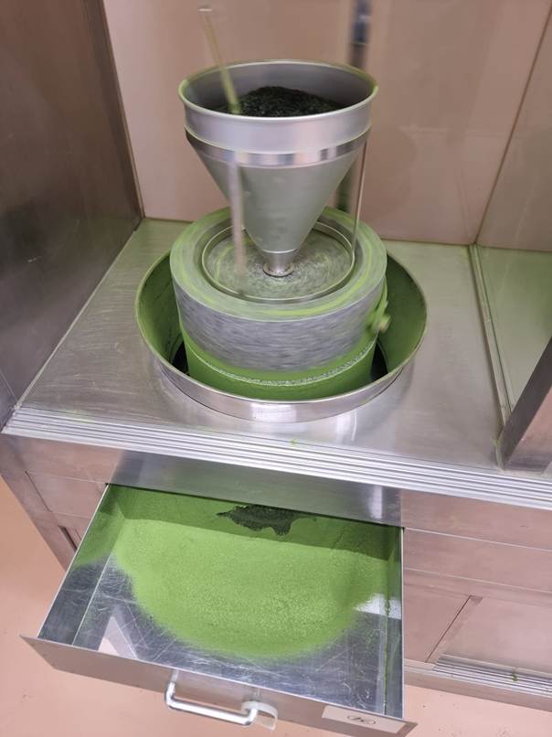 - Coarse Crushing: Tencha is first loaded into a crusher to achieve a uniform texture.